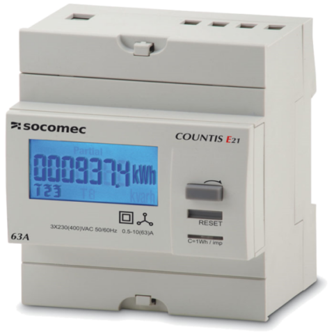 The COUNTIS E2x is a modular active electrical energy meter displaying the energy and power consumed (kWh and kW). It is designed for three-phase networks and allows a direct connection of up to 63/80 A.